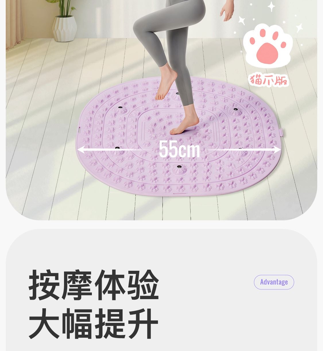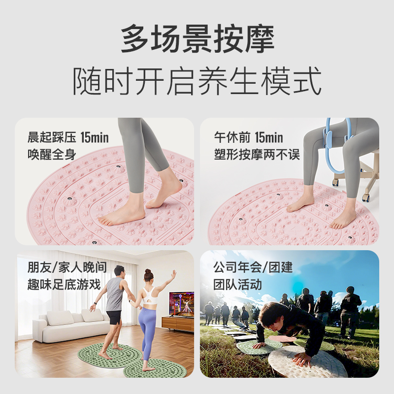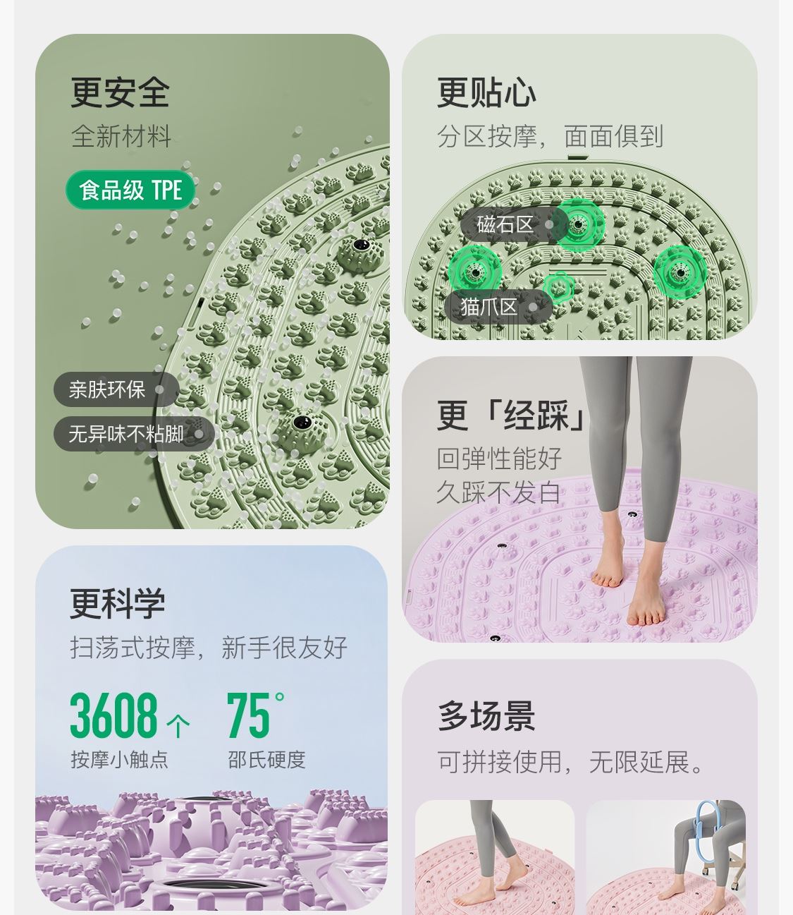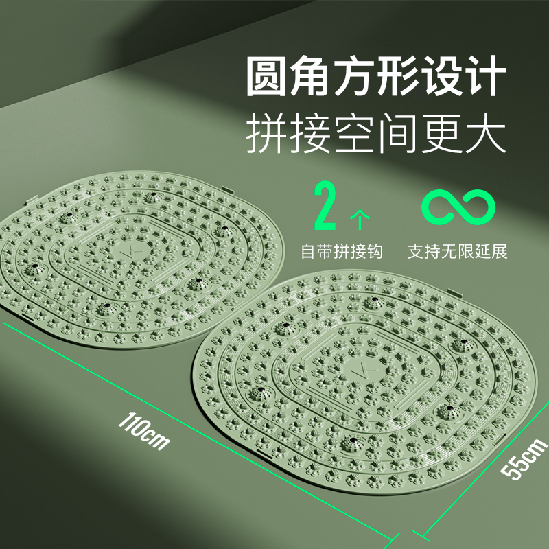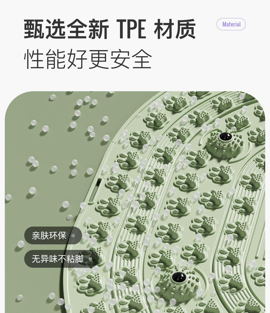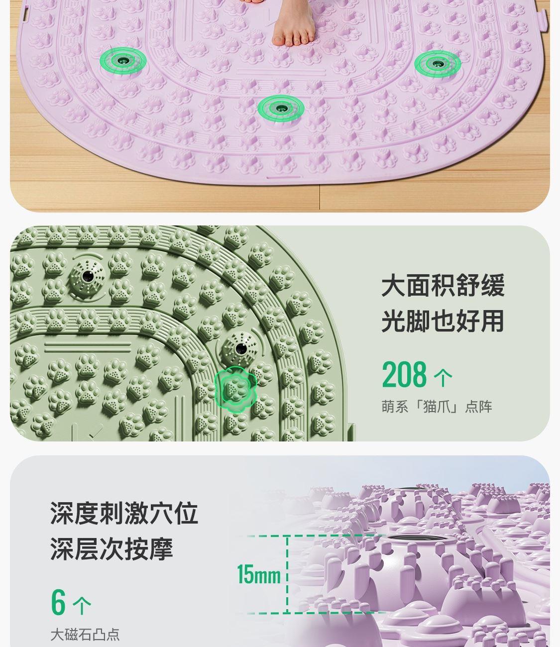 尺寸:55*55cm 顏色:綠色,粉色,紫色,灰色: 材質(zhì):TPE;環(huán)保無毒材質(zhì) 方形圓角加大加密設(shè)計(jì) 287個(gè)仿「貓爪」 設(shè)計(jì)雙分區(qū)多功能按摩 75°科學(xué)刺激硬度 支持無限串聯(lián)拓展 3068個(gè)加密按摩凸點(diǎn) 可做浴室防滑墊