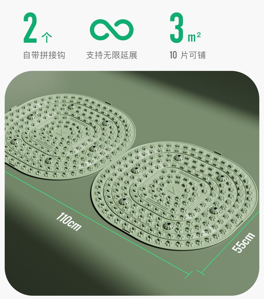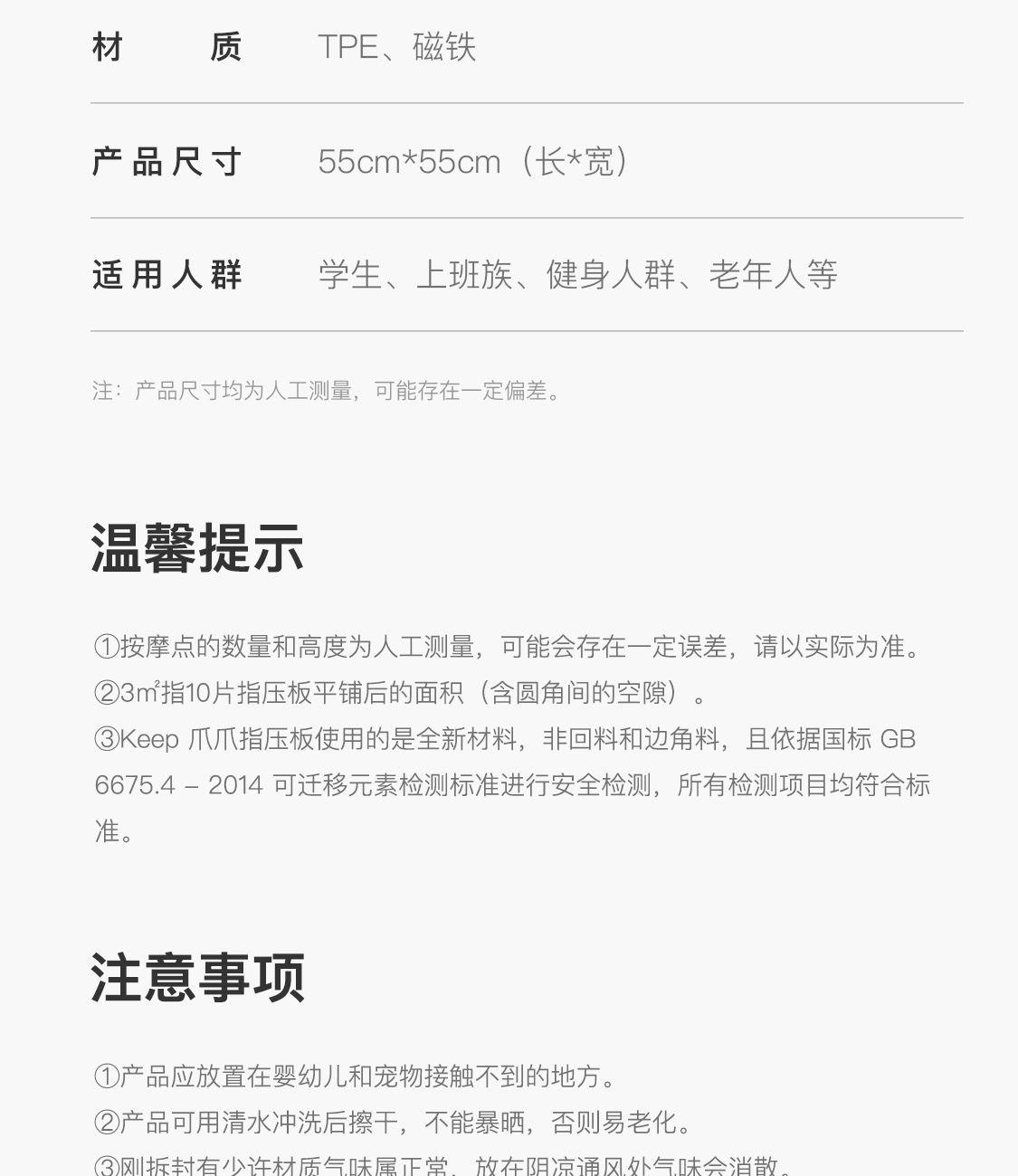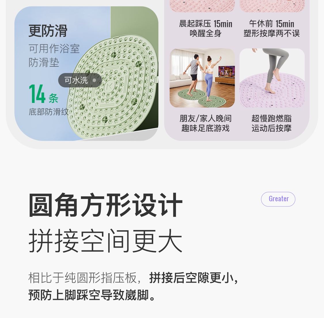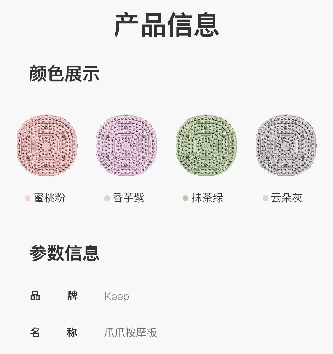 尺寸:55*55cm 顏色:綠色,粉色,紫色,灰色: 材質(zhì):TPE;環(huán)保無毒材質(zhì) 方形圓角加大加密設(shè)計(jì) 287個(gè)仿「貓爪」 設(shè)計(jì)雙分區(qū)多功能按摩 75°科學(xué)刺激硬度 支持無限串聯(lián)拓展 3068個(gè)加密按摩凸點(diǎn) 可做浴室防滑墊