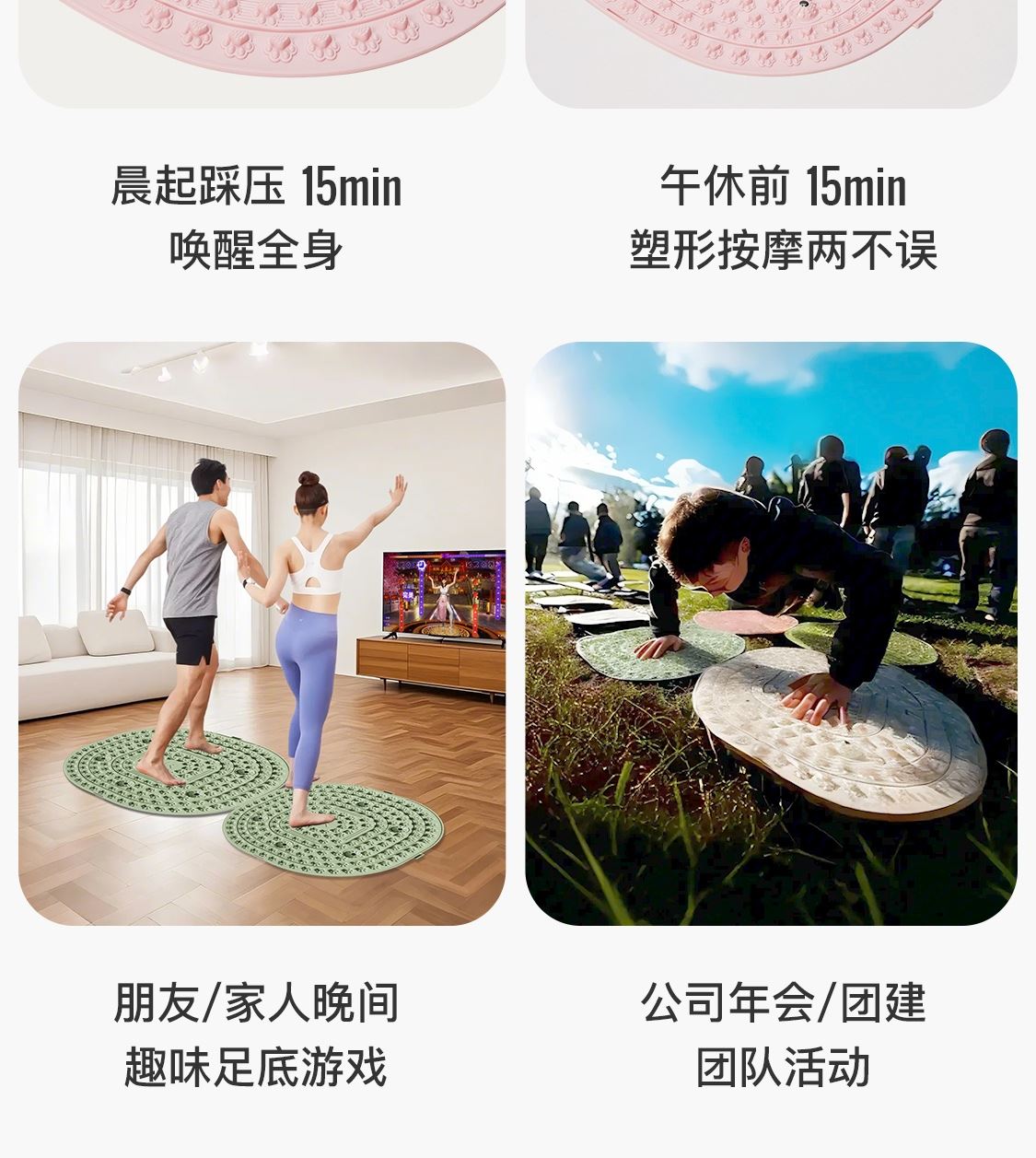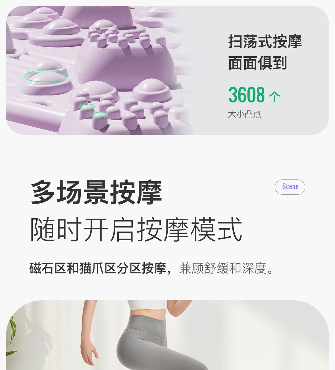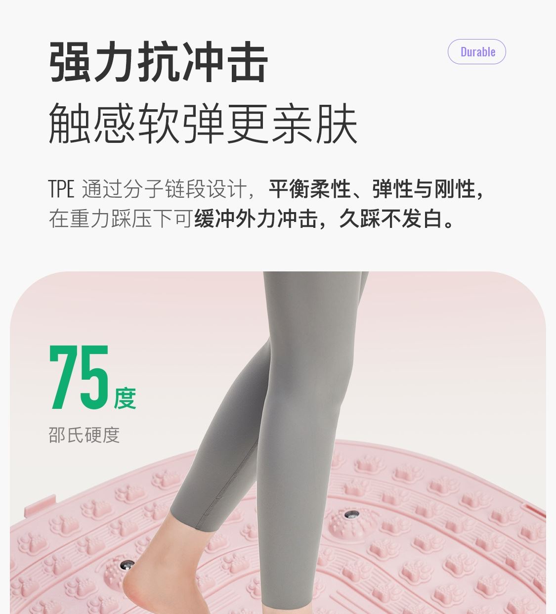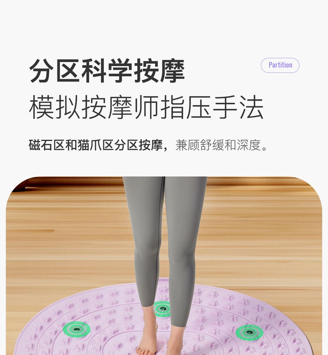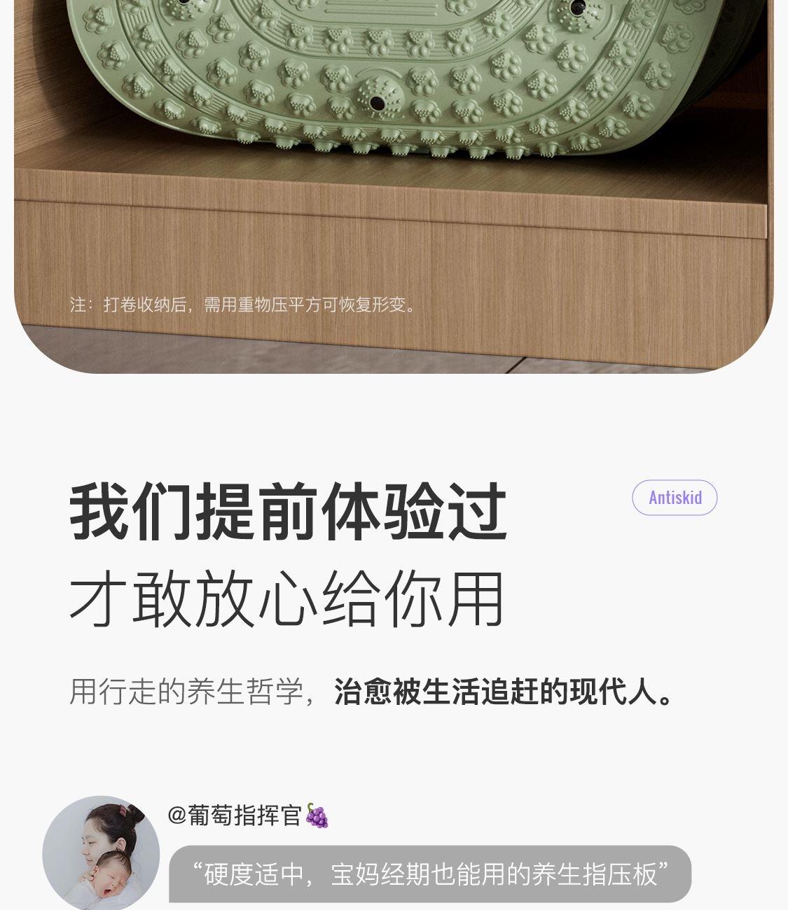 尺寸:55*55cm 顏色:綠色,粉色,紫色,灰色: 材質(zhì):TPE;環(huán)保無毒材質(zhì) 方形圓角加大加密設(shè)計(jì) 287個(gè)仿「貓爪」 設(shè)計(jì)雙分區(qū)多功能按摩 75°科學(xué)刺激硬度 支持無限串聯(lián)拓展 3068個(gè)加密按摩凸點(diǎn) 可做浴室防滑墊