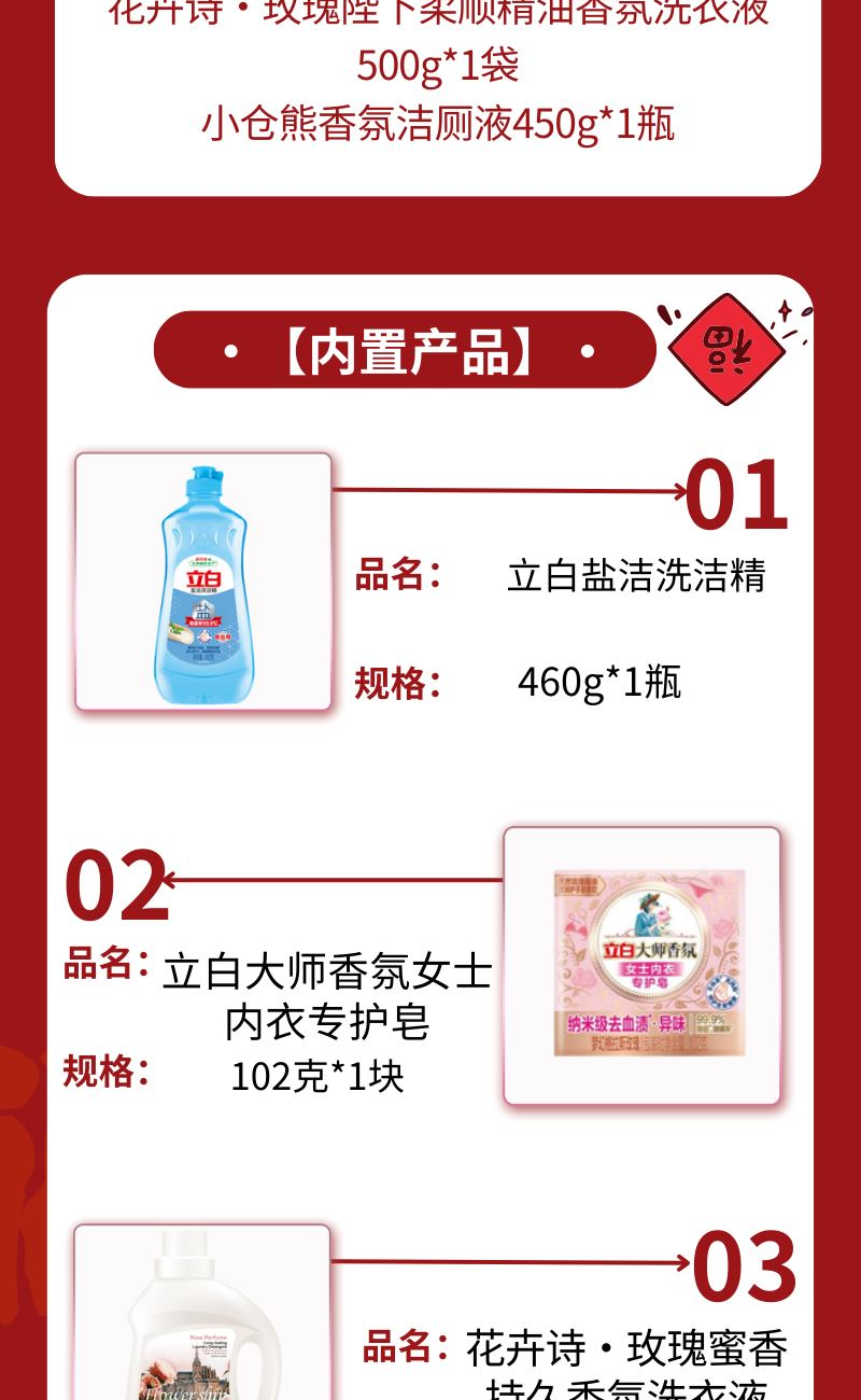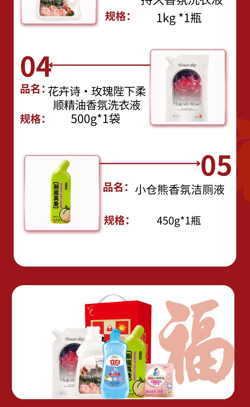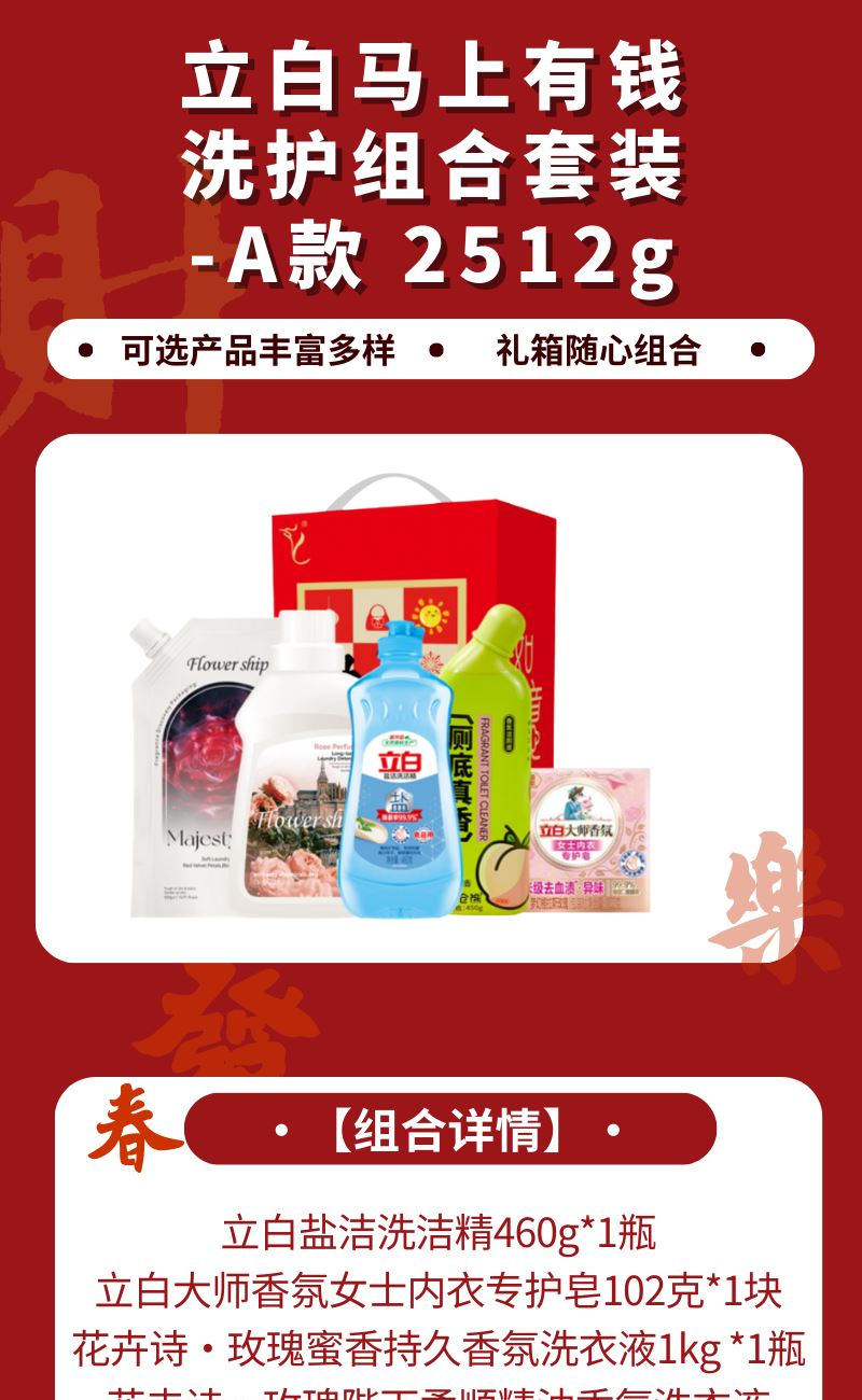配置: 立白鹽潔洗潔精460g*1瓶 立白大師香氛女士內(nèi)衣專護皂102克*1塊 花卉詩·玫瑰蜜香持久香氛洗衣液1kg *1瓶 花卉詩·玫瑰陛下柔順精油香氛洗衣液500g*1袋 小倉熊香氛潔廁液450g*1瓶 賣點: 可選產(chǎn)品豐富多樣,禮箱隨心組合,多種價位因需而定,充分滿足各種送禮需求,是商務(wù)送禮、單位福利的用心之選。