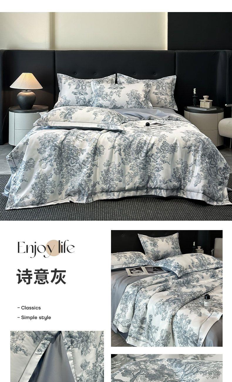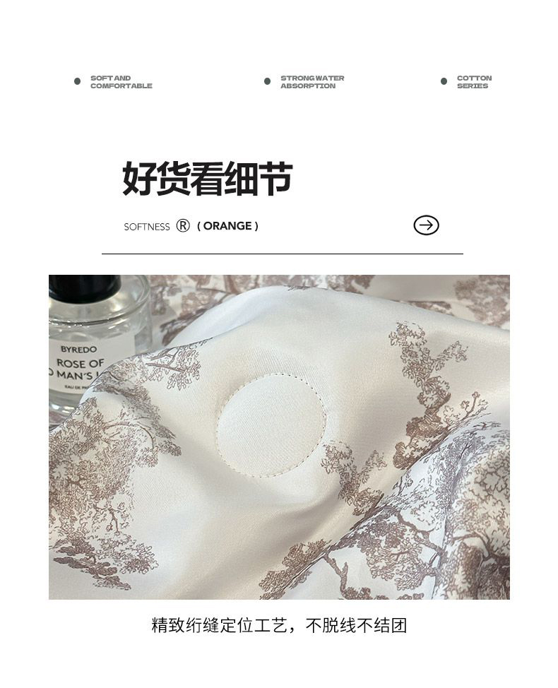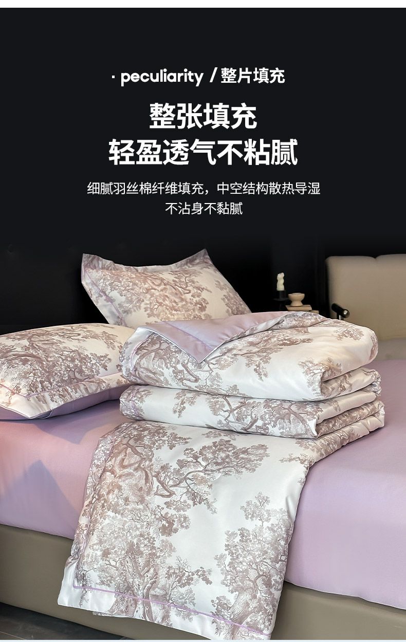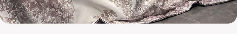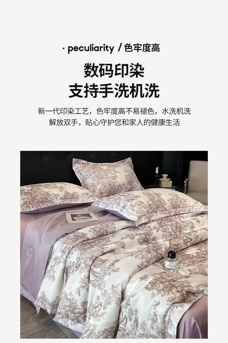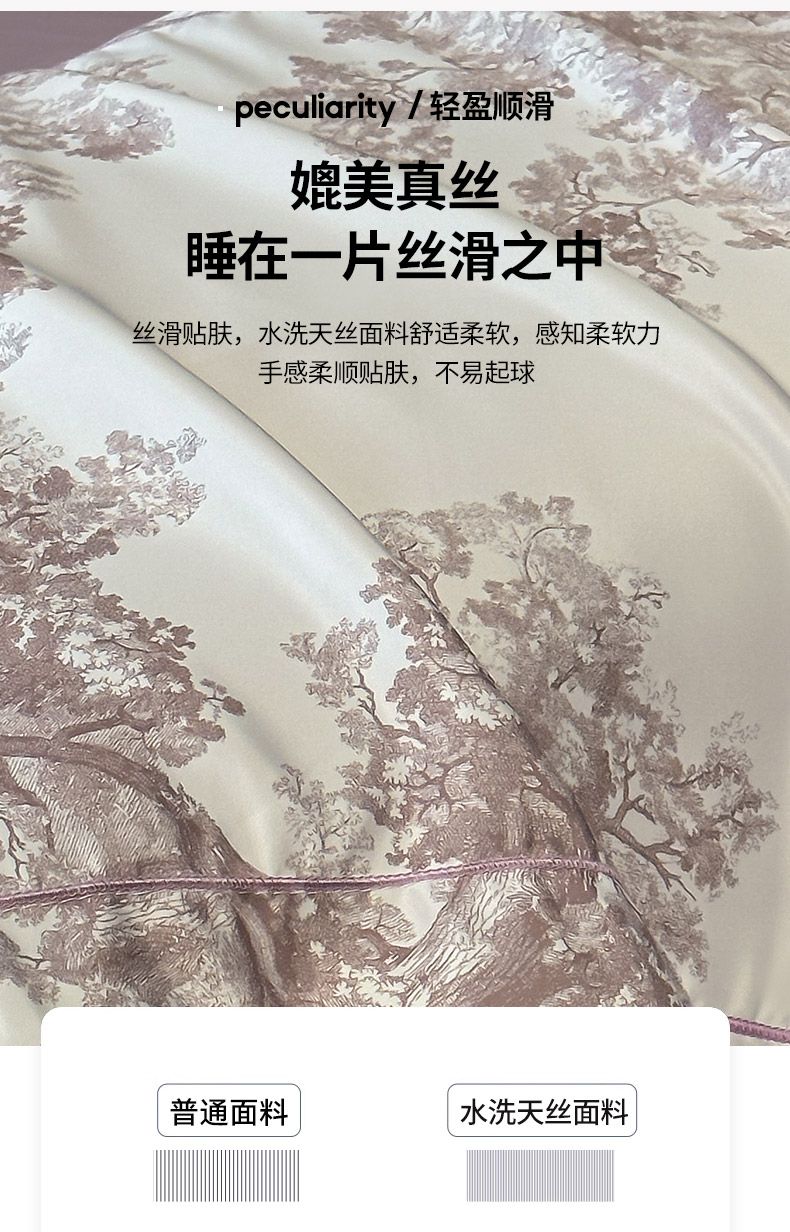 面料順滑柔軟,像絲綢一樣爽滑, 整張羽絲絨棉填充,貼身使用,無需套被套,直接貼身使用,機洗手洗均可,活色印染,久洗如新。定位絎縫工藝,寬包邊固定填充內(nèi)芯不移位,洗后不結(jié)團(tuán),吸濕透氣性。A面融入中國山水畫意境印花點綴枕套與被套,B面簡約純色,落落大方更給這床床品添加美感。