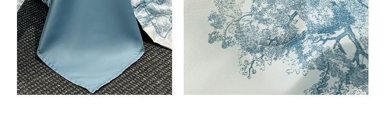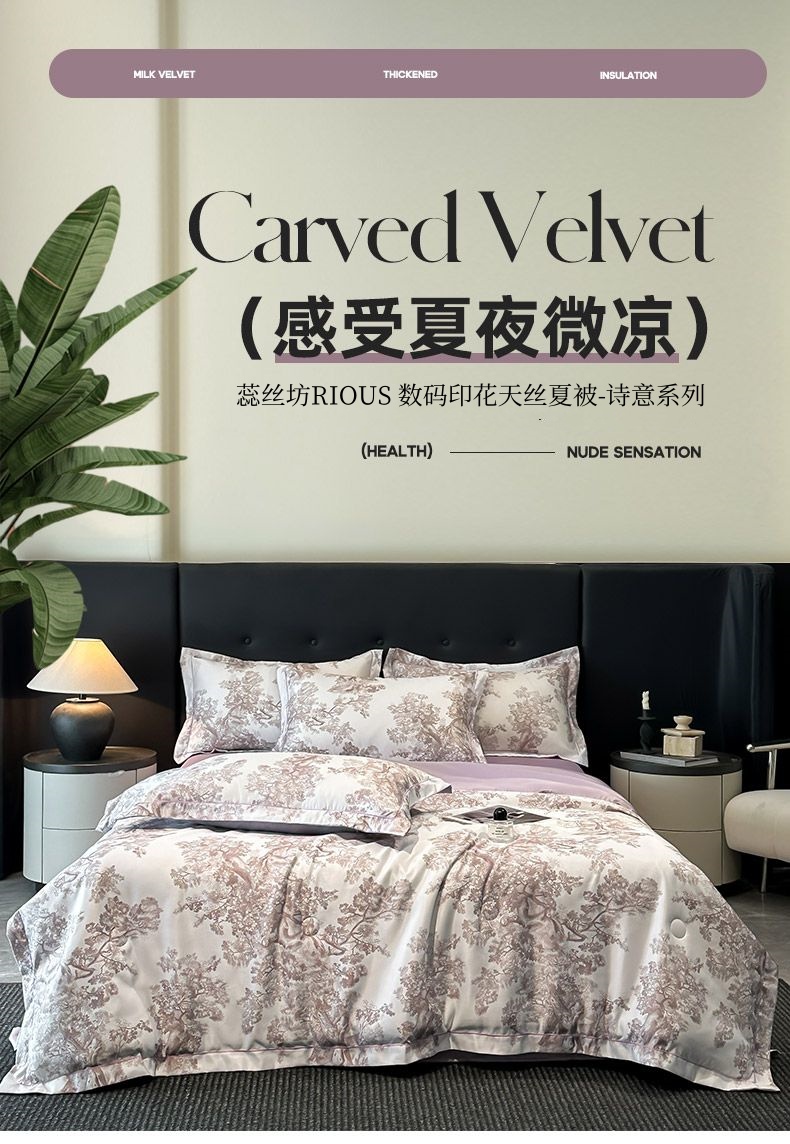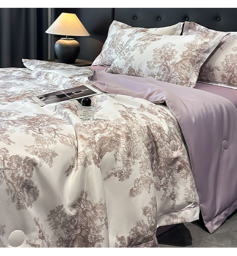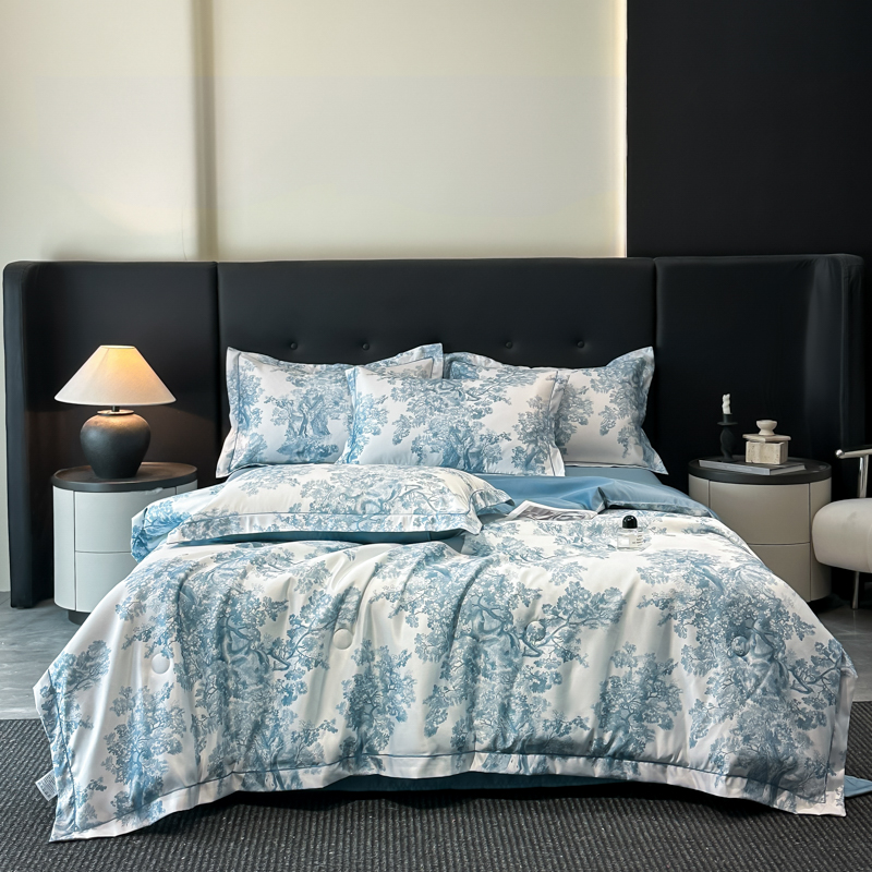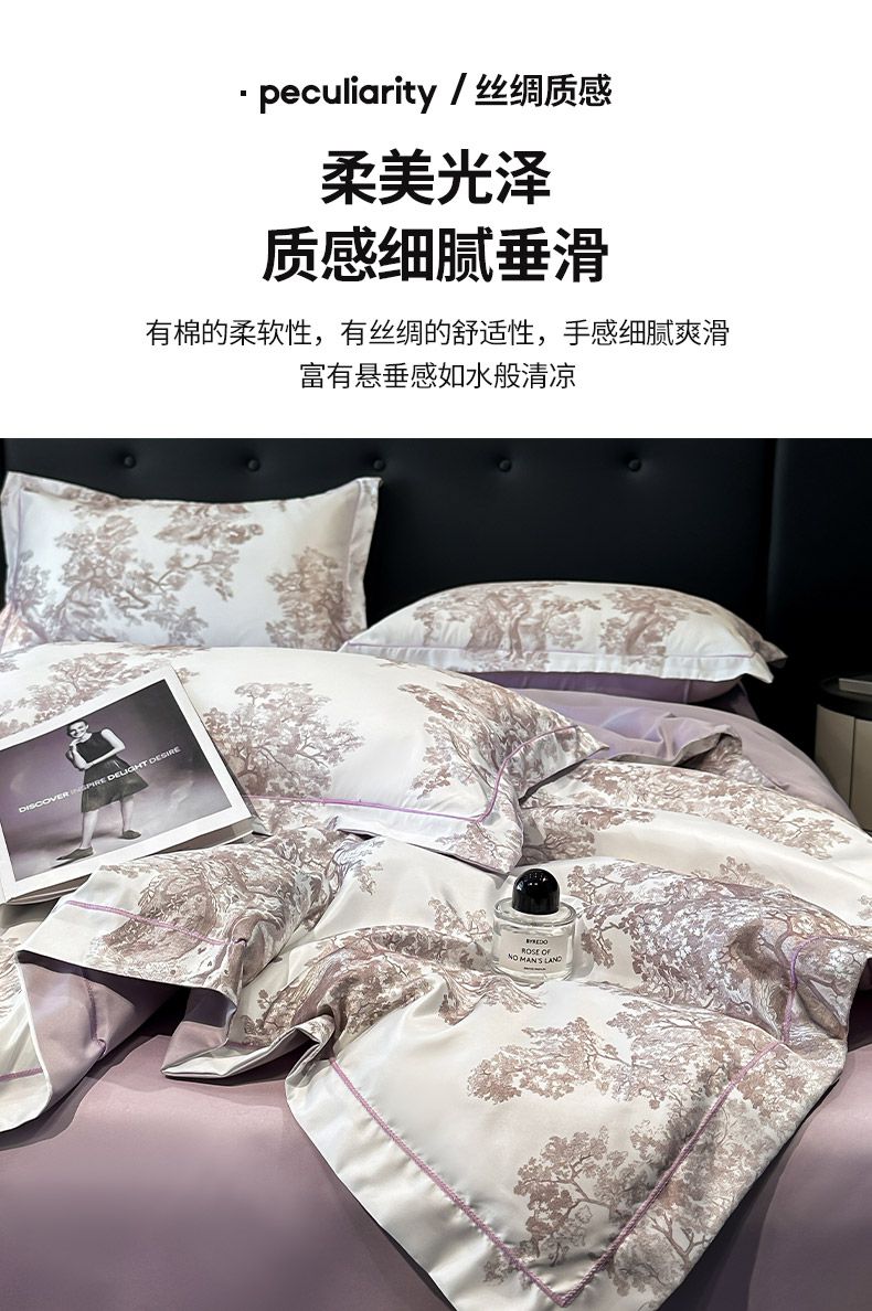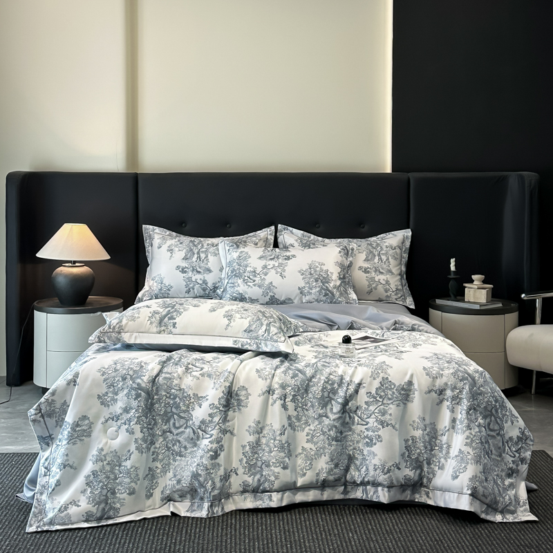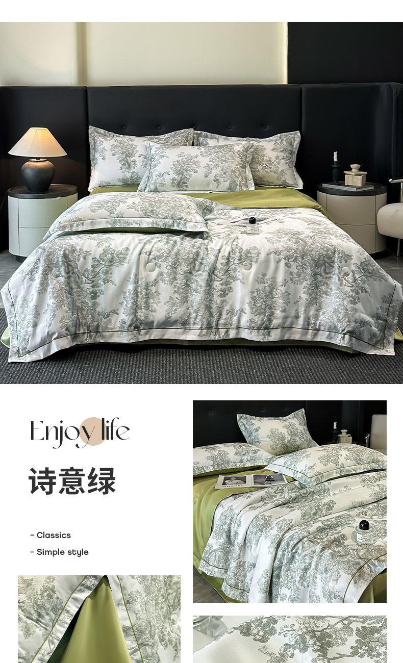 面料順滑柔軟,像絲綢一樣爽滑, 整張羽絲絨棉填充,貼身使用,無需套被套,直接貼身使用,機洗手洗均可,活色印染,久洗如新。定位絎縫工藝,寬包邊固定填充內(nèi)芯不移位,洗后不結(jié)團(tuán),吸濕透氣性。A面融入中國山水畫意境印花點綴枕套與被套,B面簡約純色,落落大方更給這床床品添加美感。