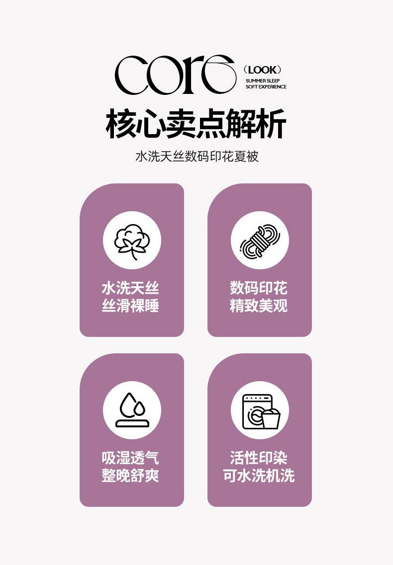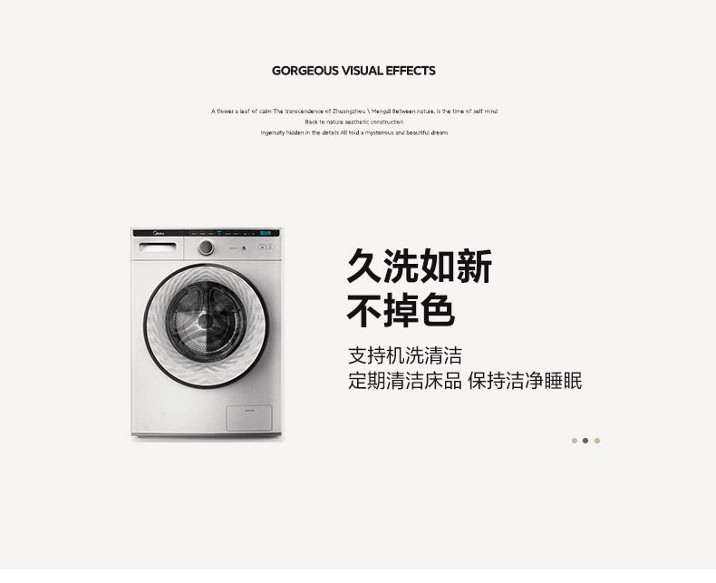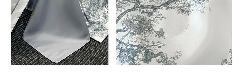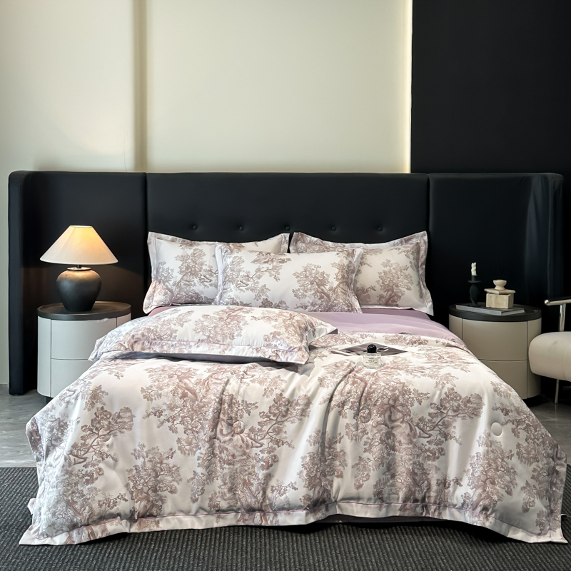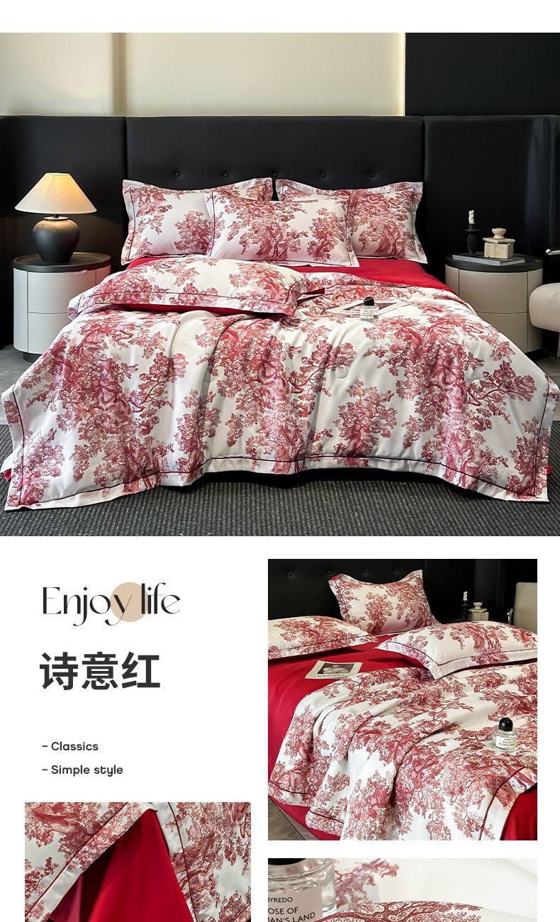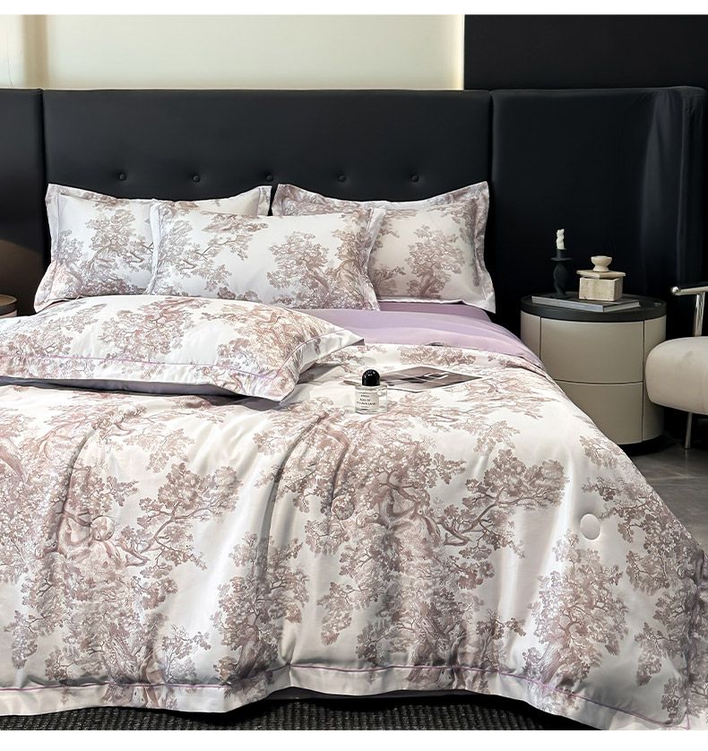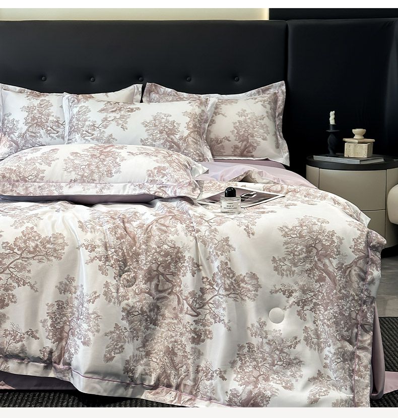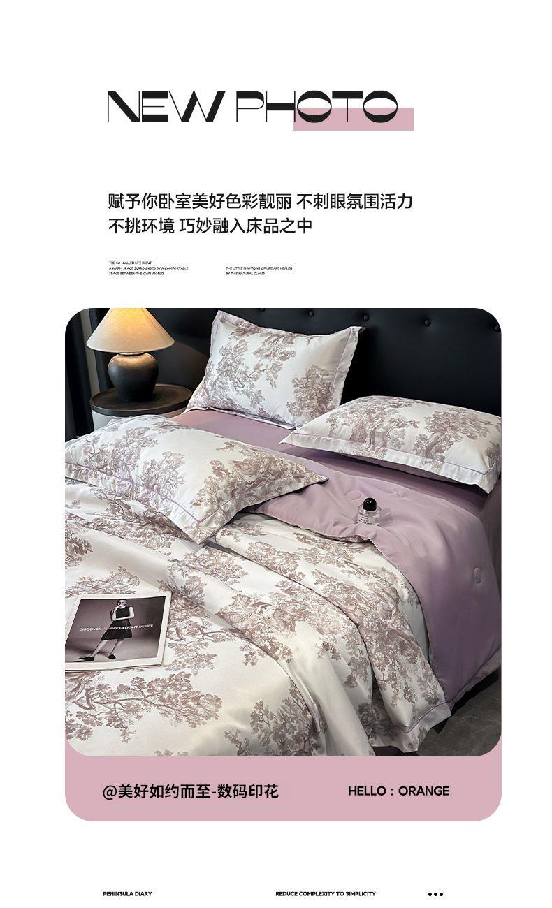 面料順滑柔軟,像絲綢一樣爽滑, 整張羽絲絨棉填充,貼身使用,無需套被套,直接貼身使用,機洗手洗均可,活色印染,久洗如新。定位絎縫工藝,寬包邊固定填充內(nèi)芯不移位,洗后不結(jié)團(tuán),吸濕透氣性。A面融入中國山水畫意境印花點綴枕套與被套,B面簡約純色,落落大方更給這床床品添加美感。