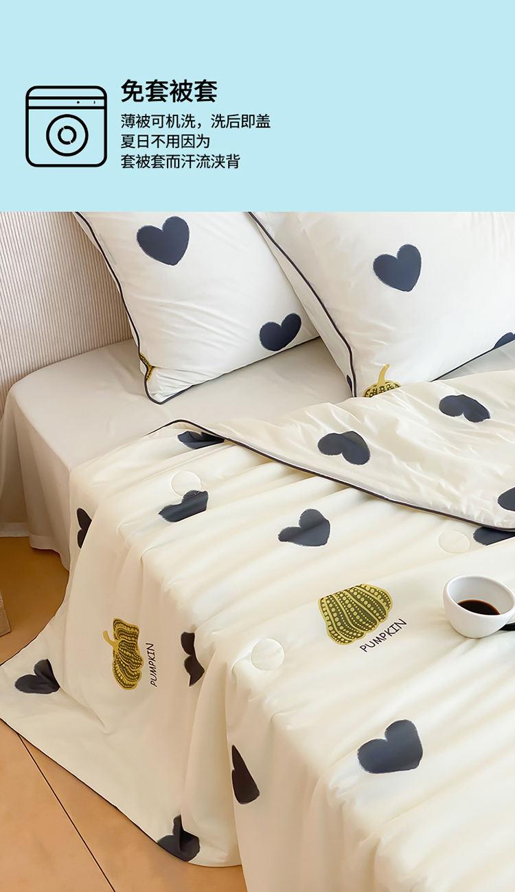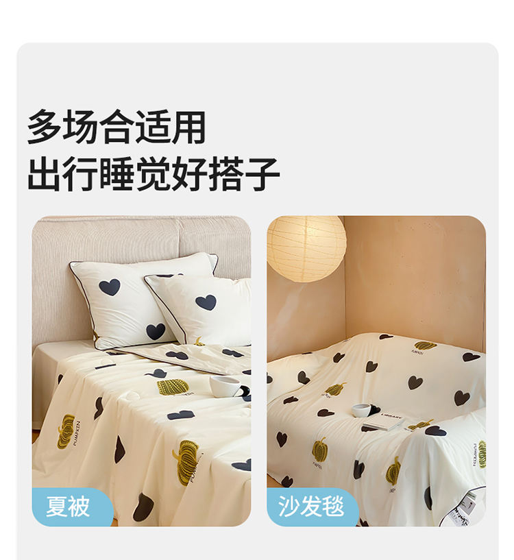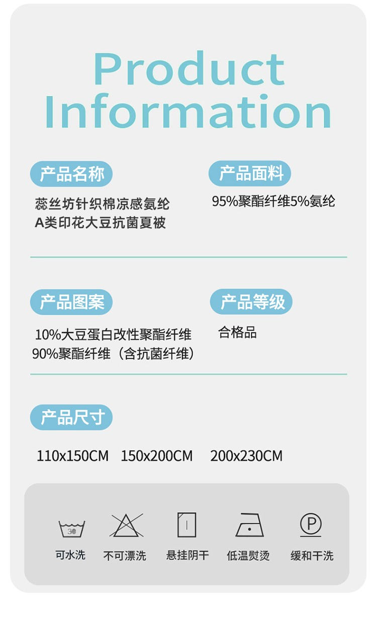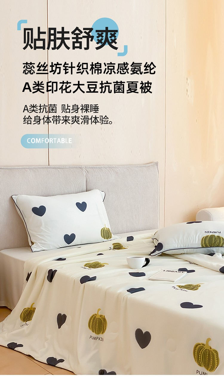 A類級別夏被,無甲醛無熒光無芳香胺,敏感肌膚均可使用,軟糯親膚無刺激;涼感針織棉面料,全新觸感,觸膚即涼;涼而不冰,干爽透氣,清涼細膩,貼身裸睡;大豆纖維填充,蓬松軟糯,吸濕透氣,久睡不易板結(jié),越睡越蓬松;機洗水洗,久洗如新。