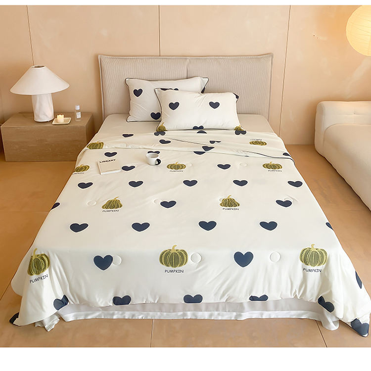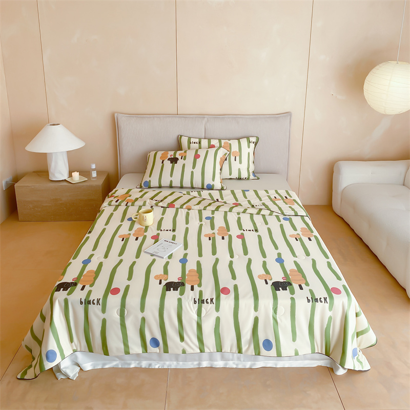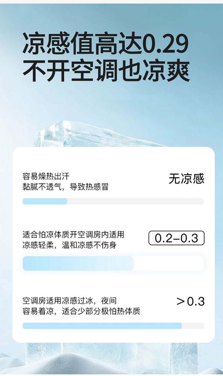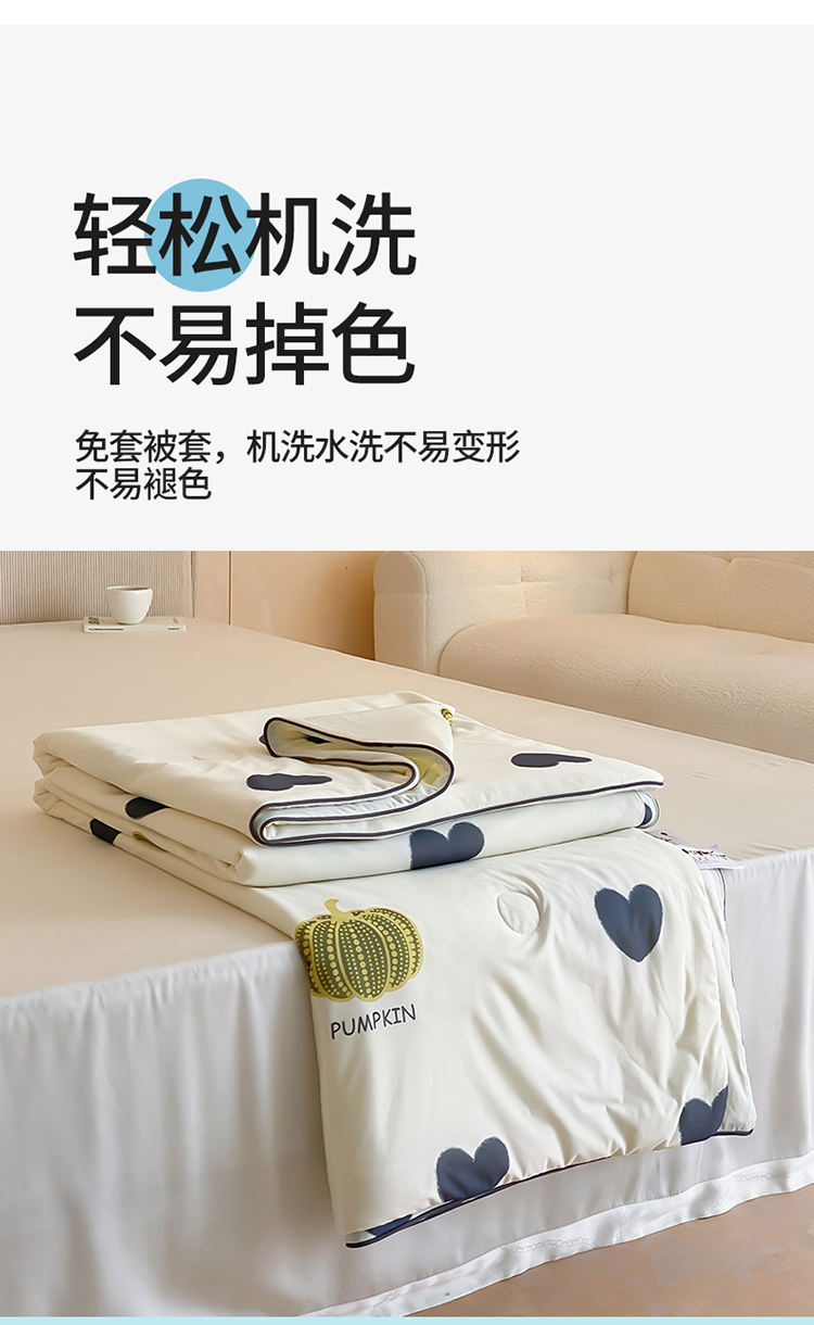 A類級別夏被,無甲醛無熒光無芳香胺,敏感肌膚均可使用,軟糯親膚無刺激;涼感針織棉面料,全新觸感,觸膚即涼;涼而不冰,干爽透氣,清涼細膩,貼身裸睡;大豆纖維填充,蓬松軟糯,吸濕透氣,久睡不易板結(jié),越睡越蓬松;機洗水洗,久洗如新。