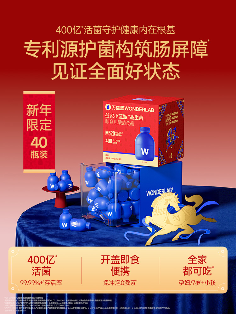 萬益藍益家小藍瓶益生菌即食乳酸菌食品40瓶裝26年新年CI款 萬益藍益家小藍瓶益生菌即食乳酸菌食品40瓶裝26年新年CI款