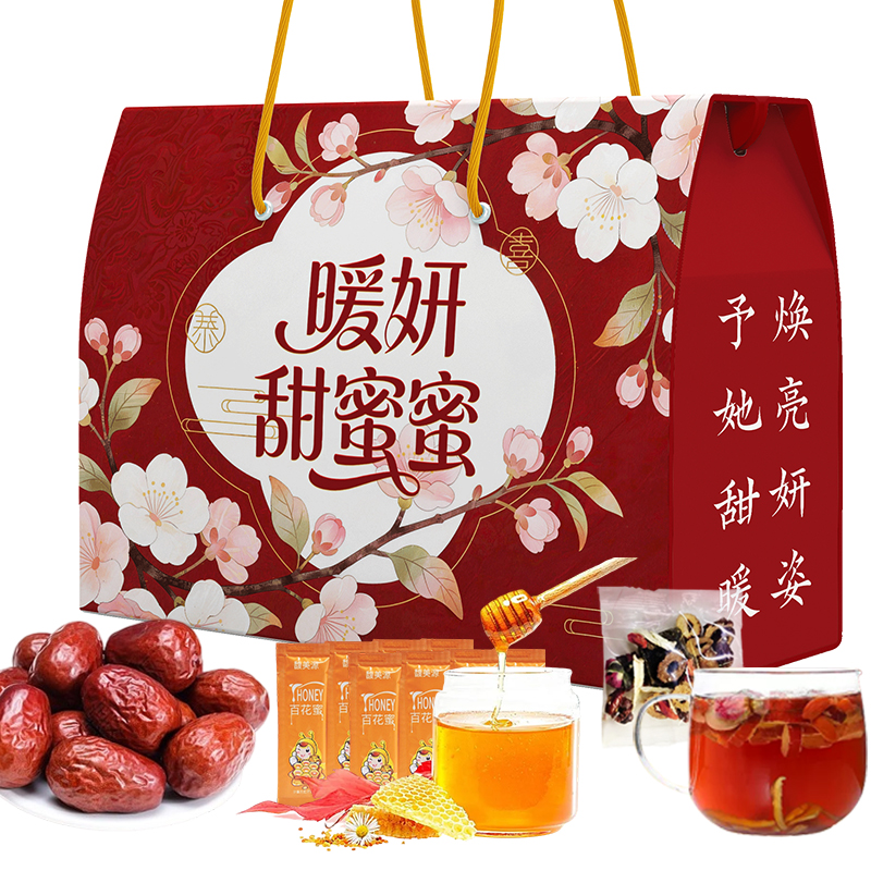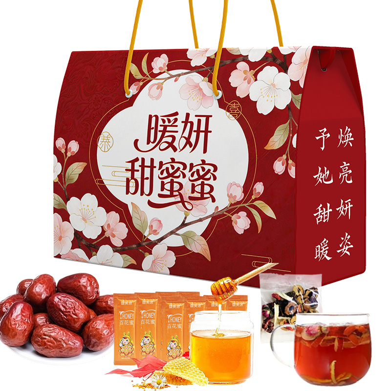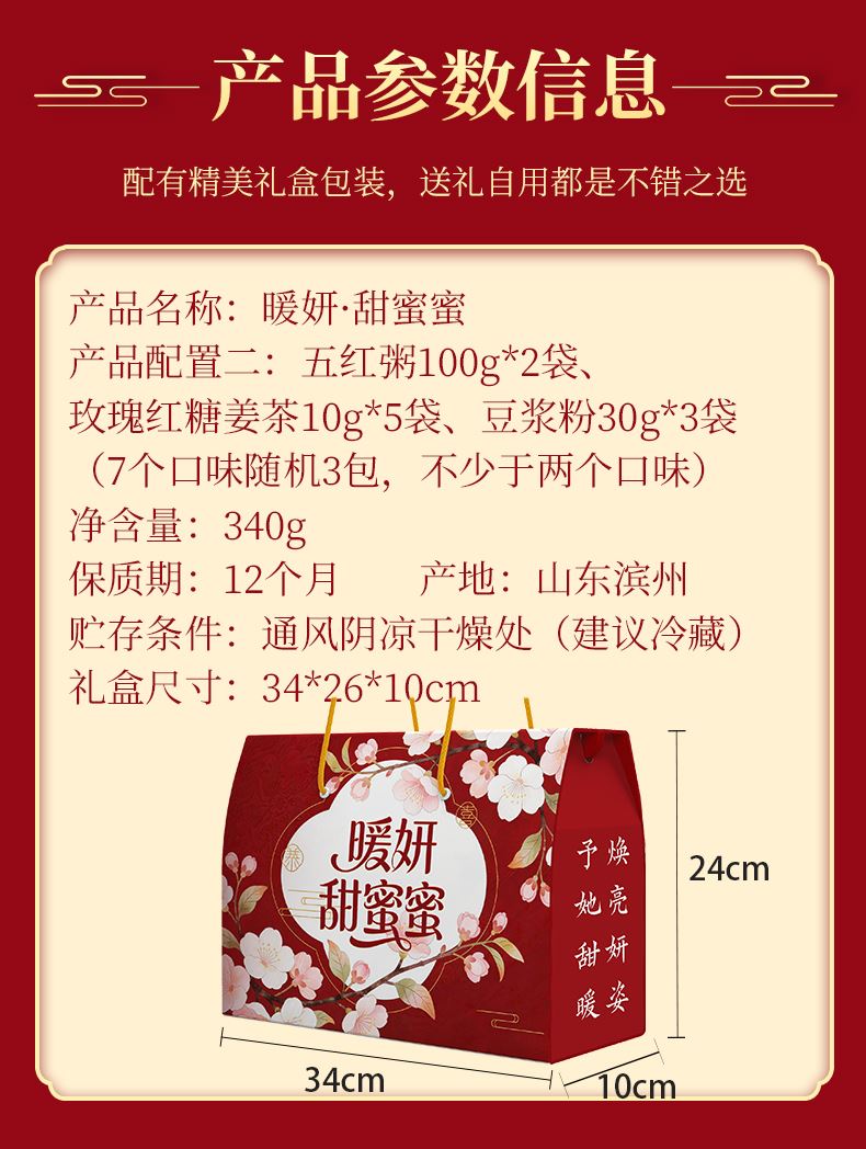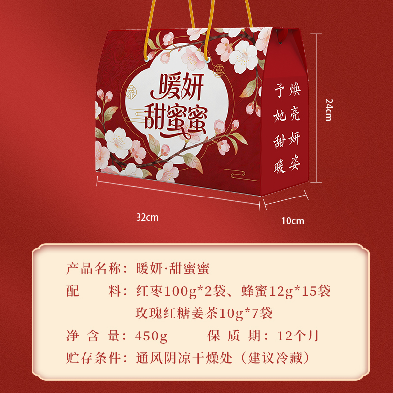 產(chǎn)品規(guī)格配置: 紅棗100g*2袋、蜂蜜12g*15袋 玫瑰紅糖姜茶10g*7袋 盒尺 寸:32*10*24cm 箱尺寸:63*34*50 箱體積:0.107方 箱重量:8.57kg