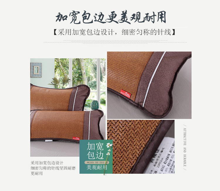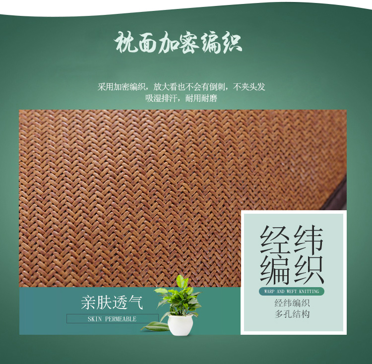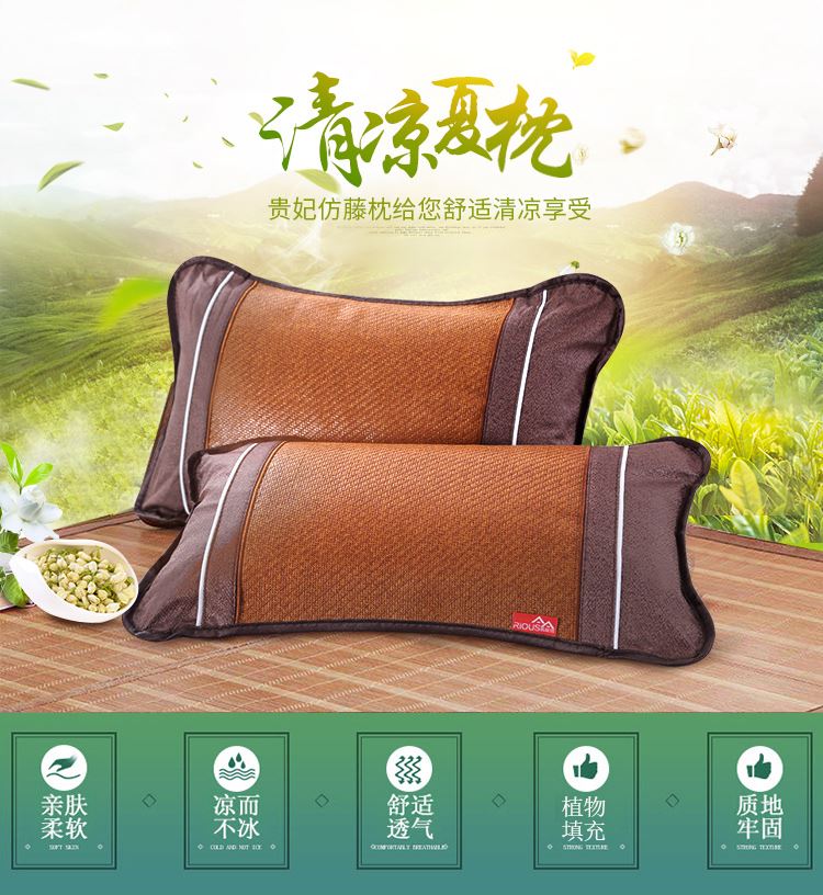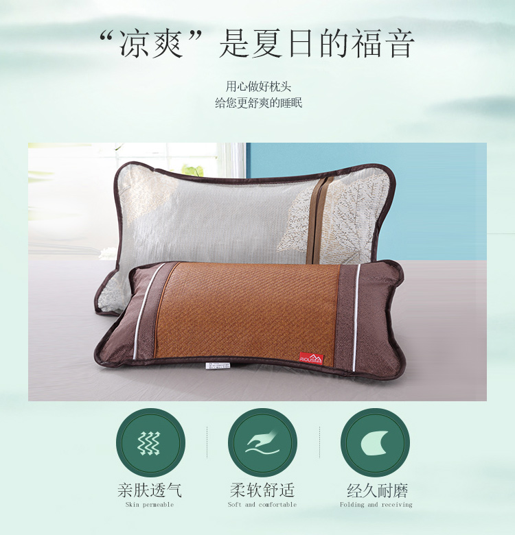 規(guī) 格:33*55cm 花 型:卡其色 面 料: 再生纖維素纖維 填充物:茉莉花+茶葉梗 雙面不同材質(zhì),一面仿藤面料編織細(xì)密,不易勾絲,涼而不冰,舒適透氣,一面冰絲,一個(gè)枕頭兩種享受,不夾頭發(fā),雙面可用綠色環(huán)保,枕套和內(nèi)芯可拆分,方便清洗枕套,內(nèi)芯采用茶葉茉莉花填充清香入眠。