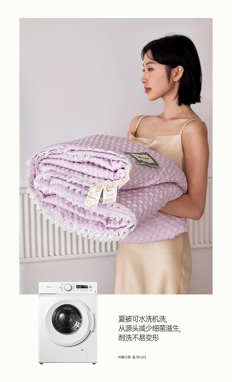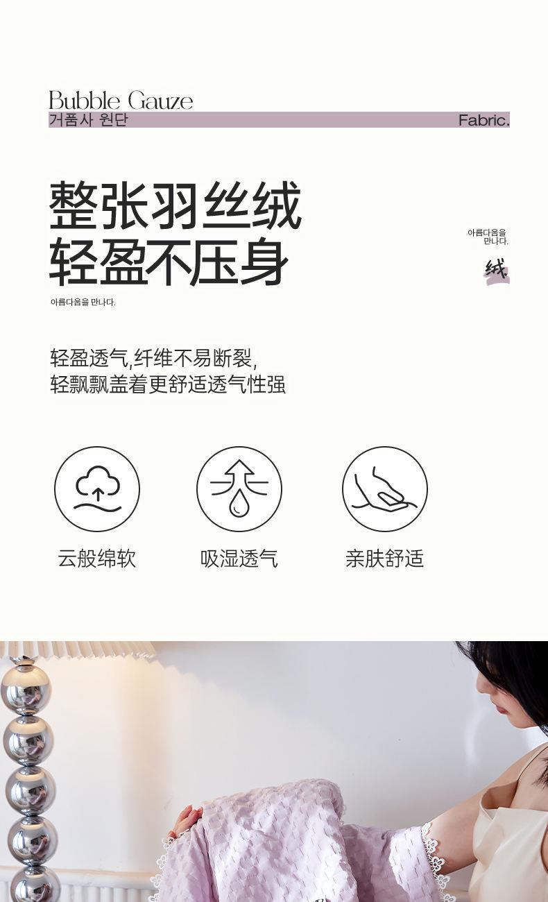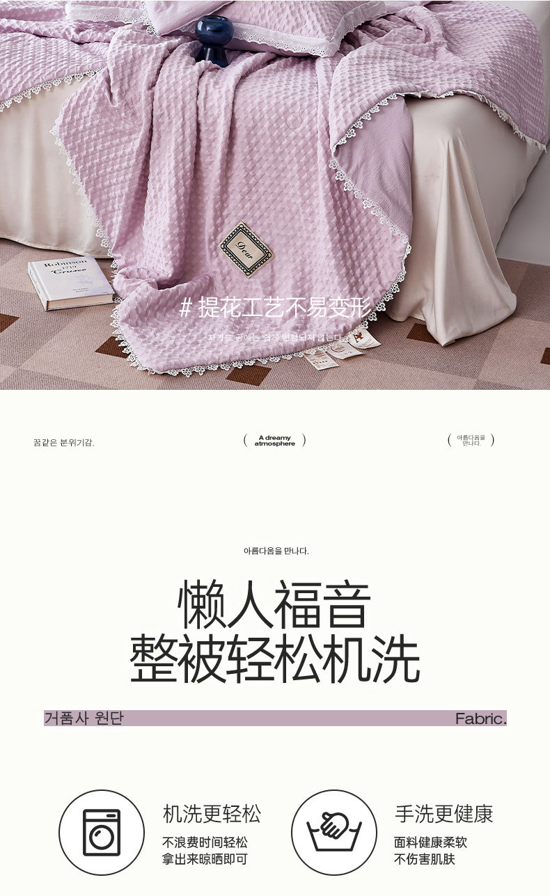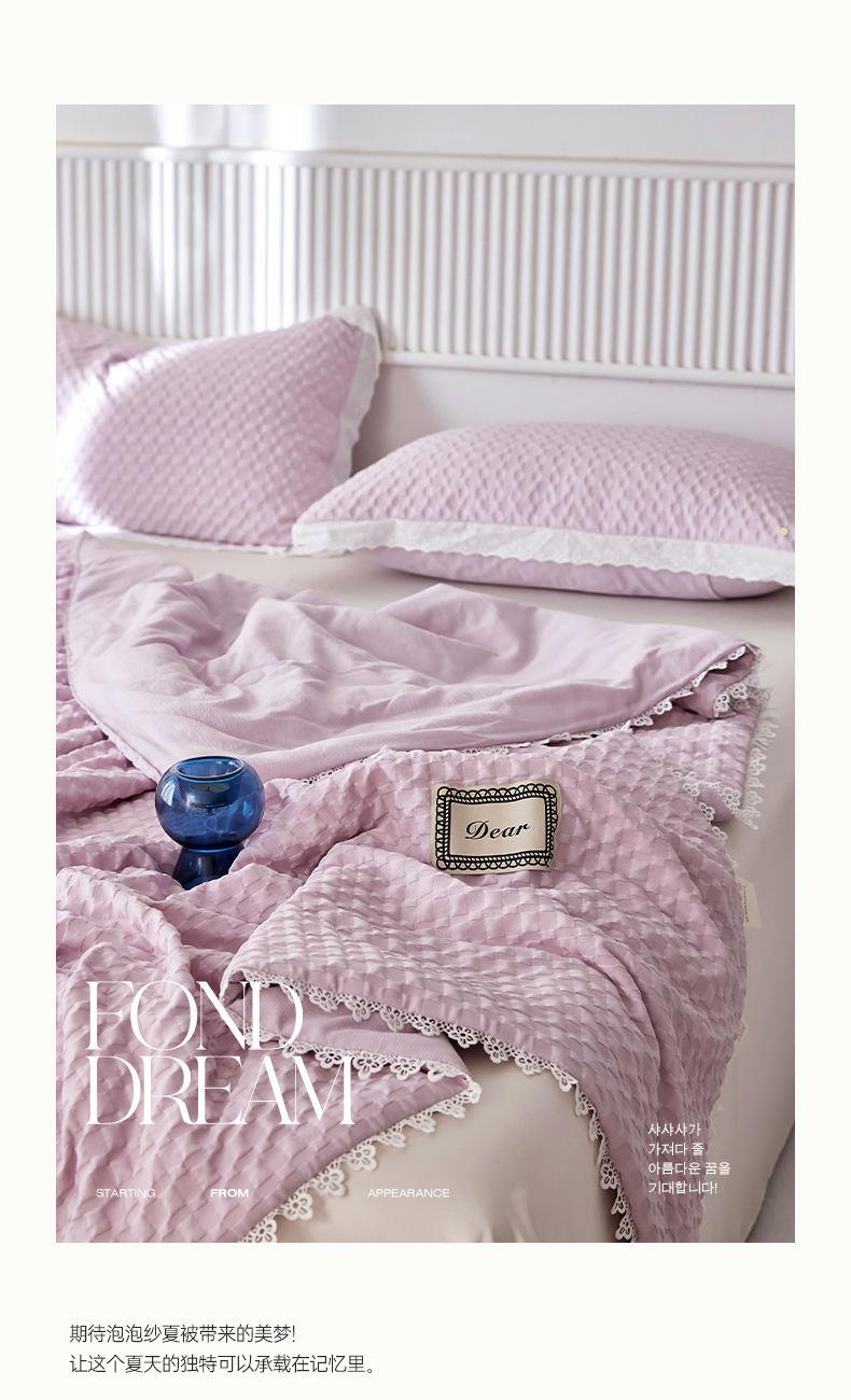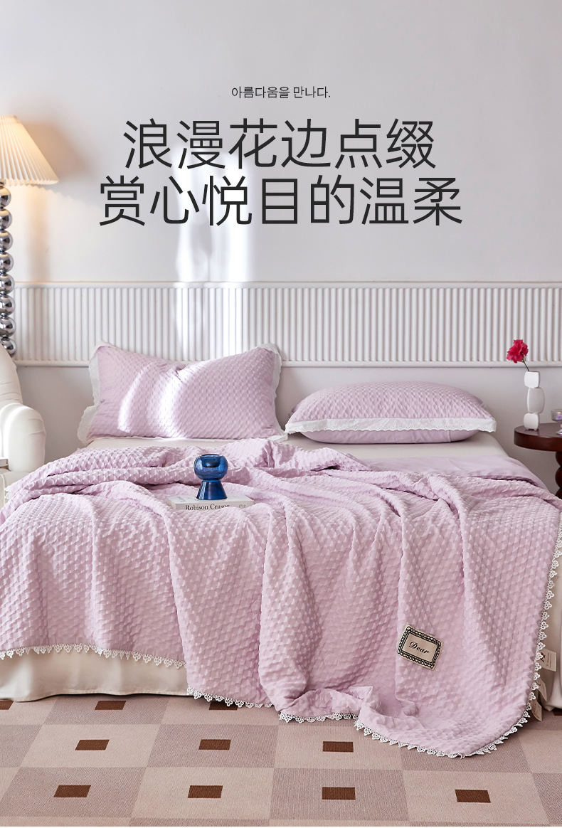 A類級別夏被,無甲醛無熒光無芳香胺,泡泡棉紗質(zhì)面料 軟糯舒適自帶微微褶皺感貼膚,不易悶熱,感知好睡眠,敏感肌膚適用;泡泡棉的透氣性能十分良好且擁有吸濕快干的優(yōu)點,優(yōu)質(zhì)整張羽絲棉填充,蓬松柔軟;無懼機洗水洗,久洗如新,解放雙手;細節(jié)滿分,方體壓泡工藝,凹凸的質(zhì)感立體有型,浪漫小花邊點綴,賞心悅目的溫柔。