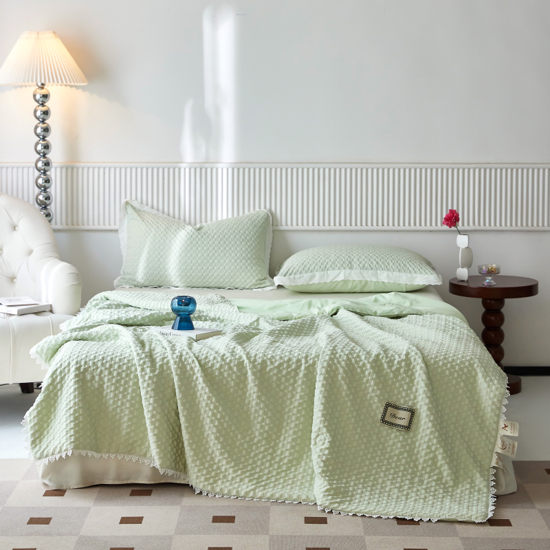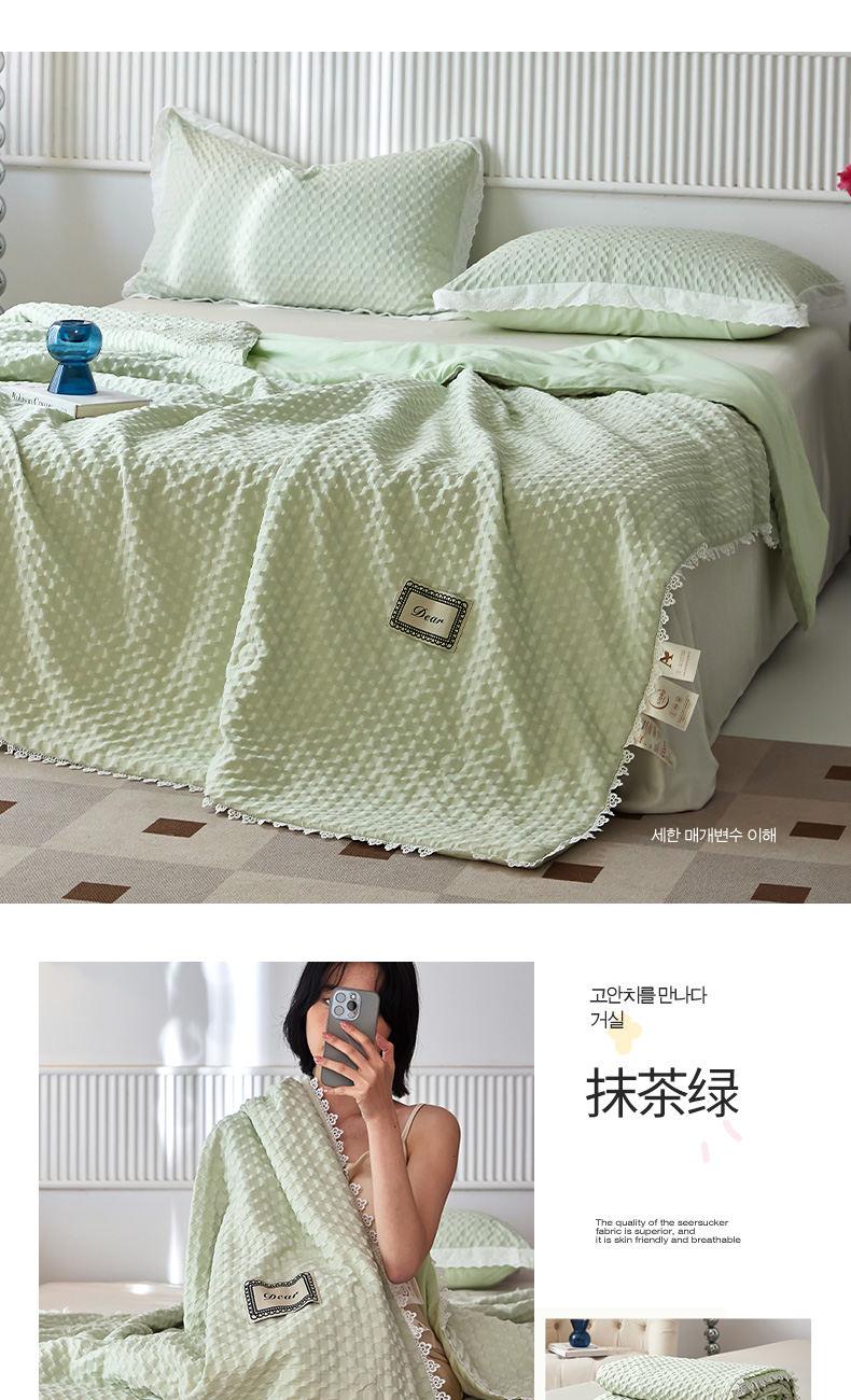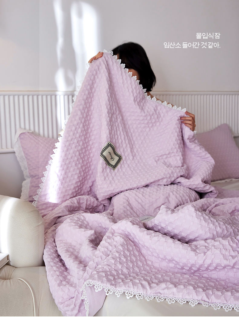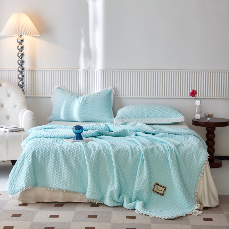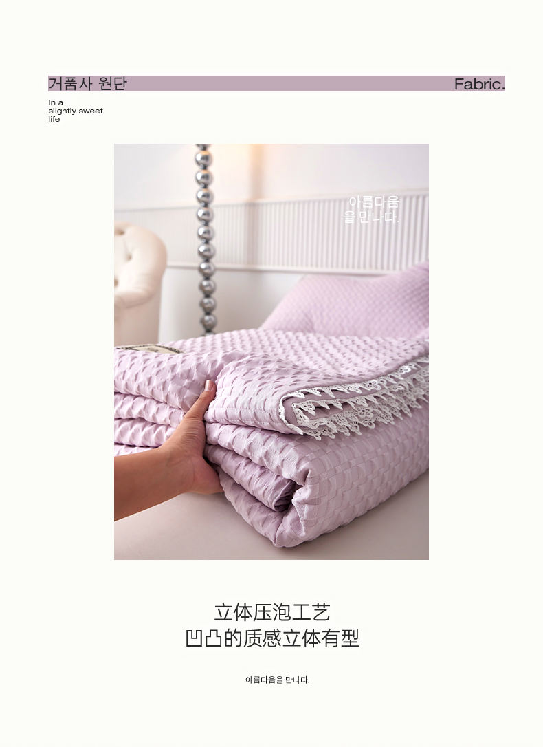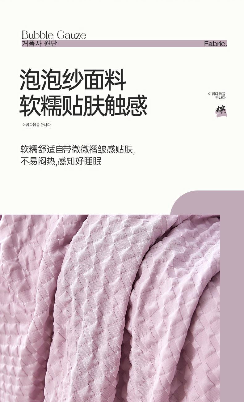 A類級別夏被,無甲醛無熒光無芳香胺,泡泡棉紗質(zhì)面料 軟糯舒適自帶微微褶皺感貼膚,不易悶熱,感知好睡眠,敏感肌膚適用;泡泡棉的透氣性能十分良好且擁有吸濕快干的優(yōu)點,優(yōu)質(zhì)整張羽絲棉填充,蓬松柔軟;無懼機洗水洗,久洗如新,解放雙手;細節(jié)滿分,方體壓泡工藝,凹凸的質(zhì)感立體有型,浪漫小花邊點綴,賞心悅目的溫柔。