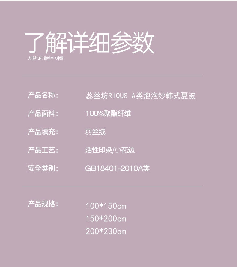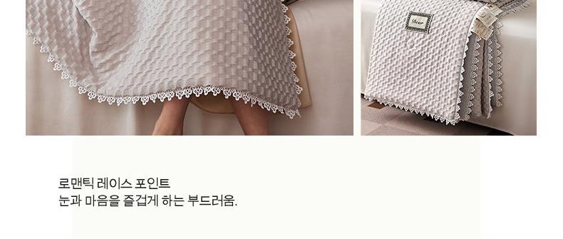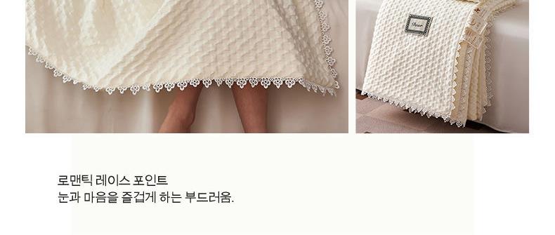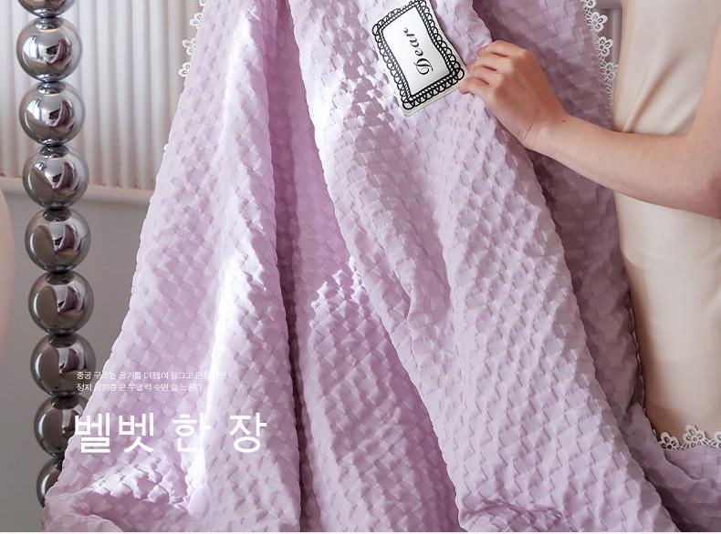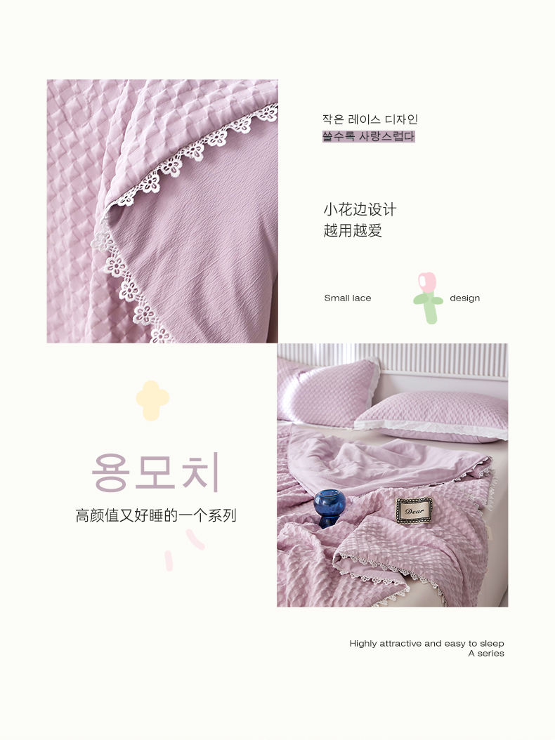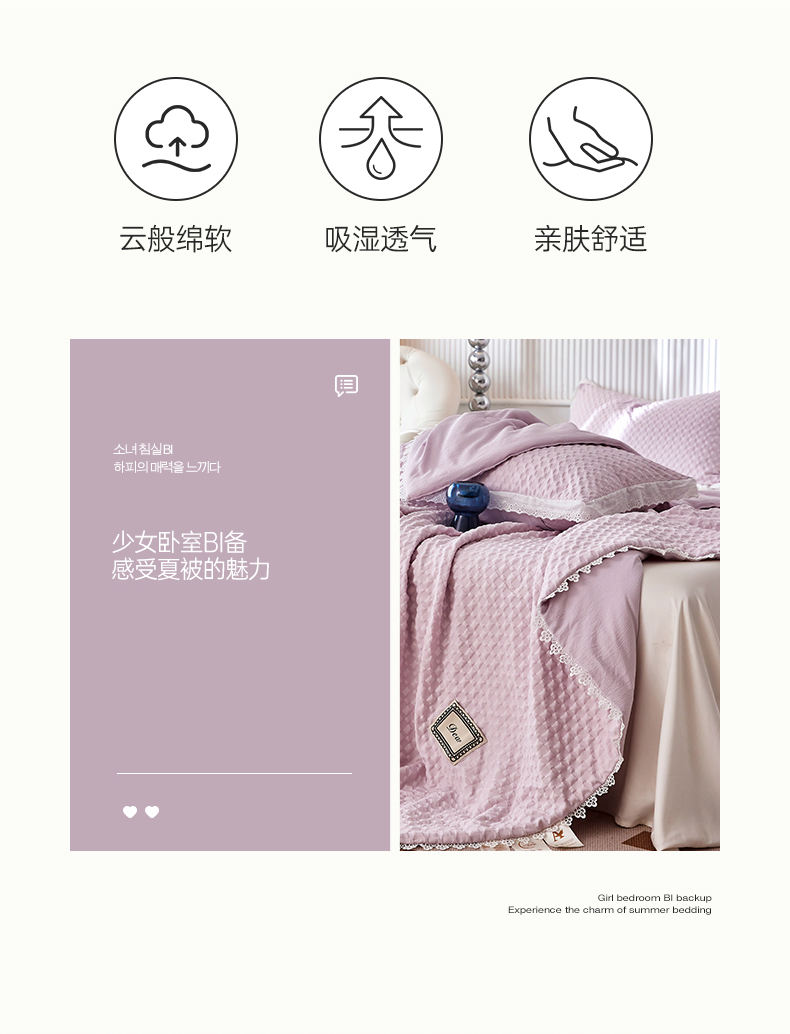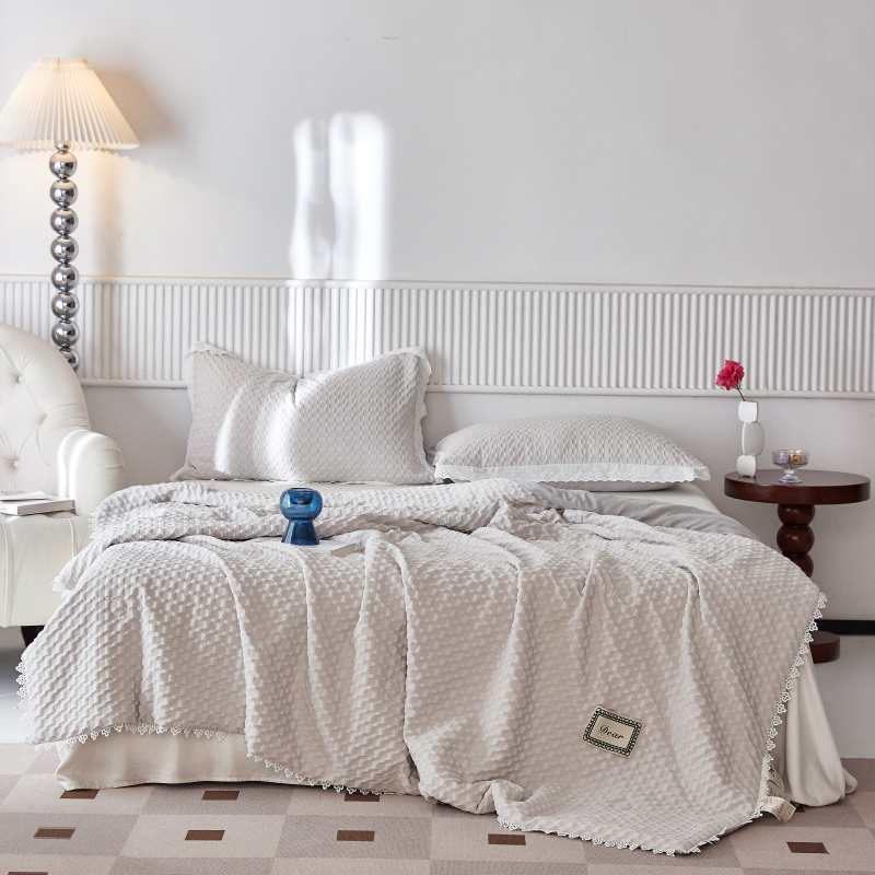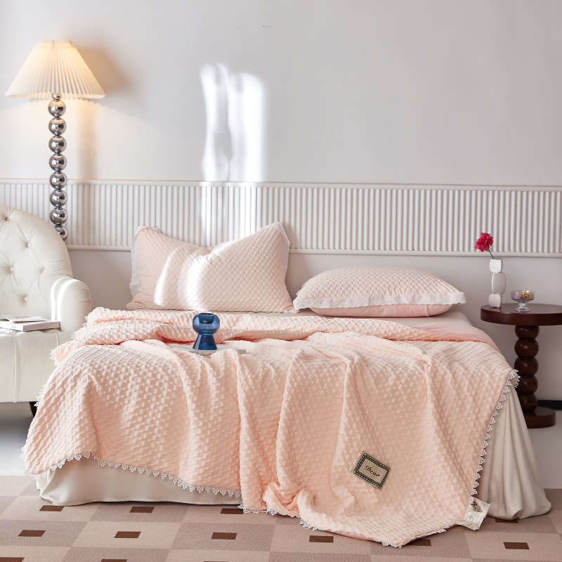 A類級別夏被,無甲醛無熒光無芳香胺,泡泡棉紗質(zhì)面料 軟糯舒適自帶微微褶皺感貼膚,不易悶熱,感知好睡眠,敏感肌膚適用;泡泡棉的透氣性能十分良好且擁有吸濕快干的優(yōu)點,優(yōu)質(zhì)整張羽絲棉填充,蓬松柔軟;無懼機洗水洗,久洗如新,解放雙手;細節(jié)滿分,方體壓泡工藝,凹凸的質(zhì)感立體有型,浪漫小花邊點綴,賞心悅目的溫柔。