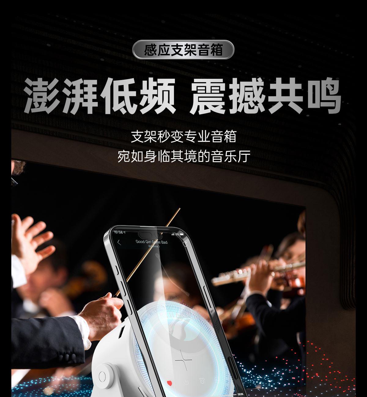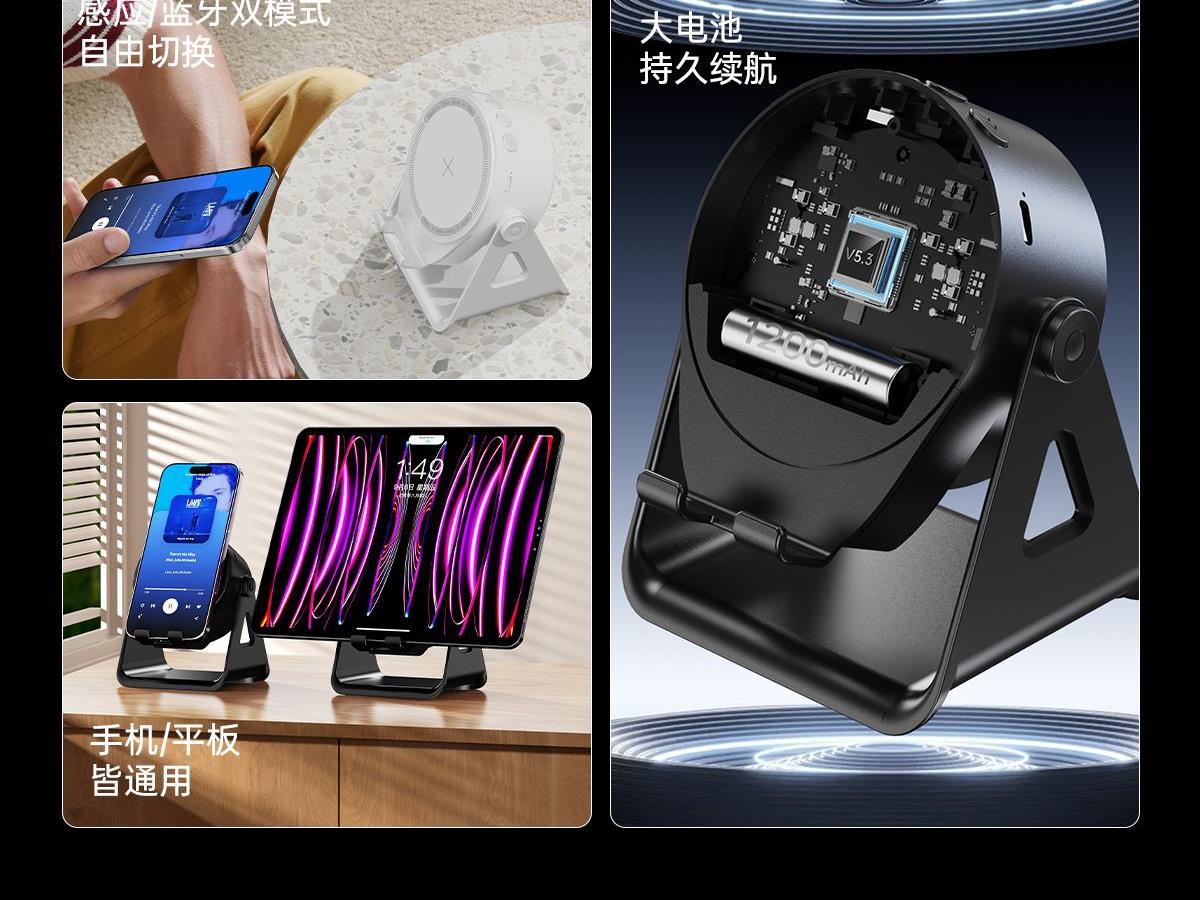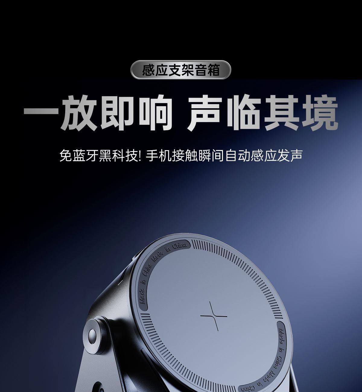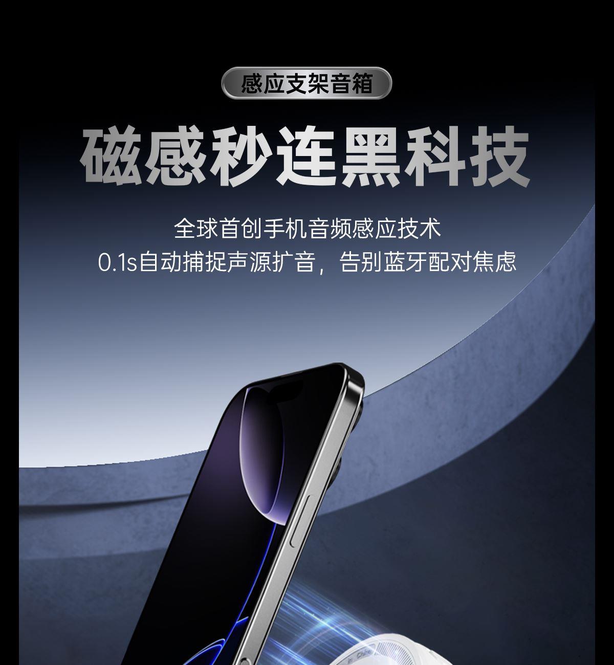 1、黑科技新款感應(yīng)音響,磁感2秒連黑科技,一放即響,無需連接藍(lán)牙; 3.內(nèi)置感應(yīng)裝置,手機(jī)靠近即可感應(yīng)成手機(jī)音頻,聲臨其境; 4、52mm大尺寸喇叭震撼音效,感應(yīng)、藍(lán)牙雙模式隨意切換; 5、兼用性強(qiáng),手機(jī)平板通用; 6.內(nèi)置1200MAH鋰電池持久續(xù)航